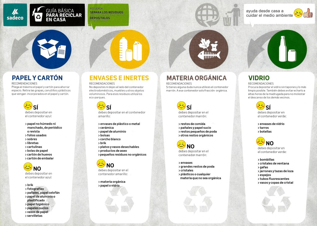 - Se deben clasificar los residuos según lo que marca la normativa legal vigente atendiendo a su reciclaje, que exige la separación según su origen (papel, envases, vidrio, materia orgánica) para ser depositados en los contenedores correspondientes.