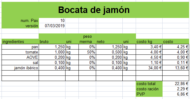 El jefe de cocina o chef será el responsable de confeccionar la ficha técnica de cada elaboración, y es sin duda una valiosa herramienta para realizar un buen cálculo de las necesidades de género y de esta forma no hacer más pedido al economato del que verdaderamente se necesita para la producción diaria.