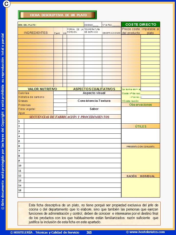 La ficha técnica recoge toda la información relativa al proceso de elaboración de un plato, lo cual constituye una interesante herramienta para controlar, tanto los productos, como el proceso de producción.