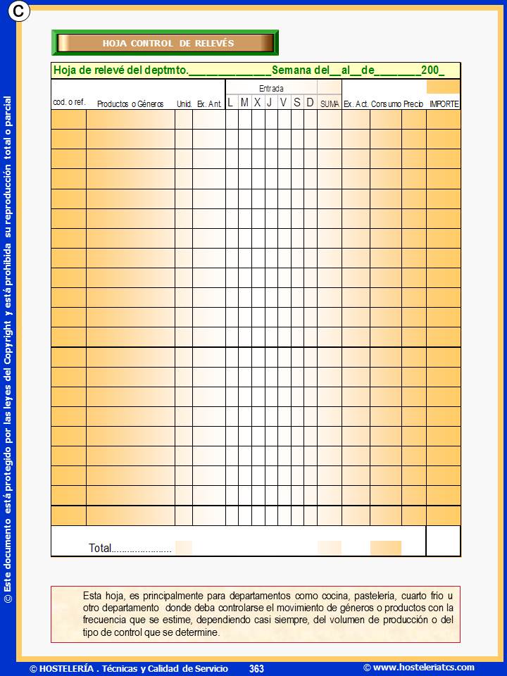 En el relevé quedan recogidos los insumos correspondientes a una semana. Este parte de consumo de existencias o parte de control diarios es muy útil para calcular las necesidades de género en base a su movimiento, entradas y salidas del economato.