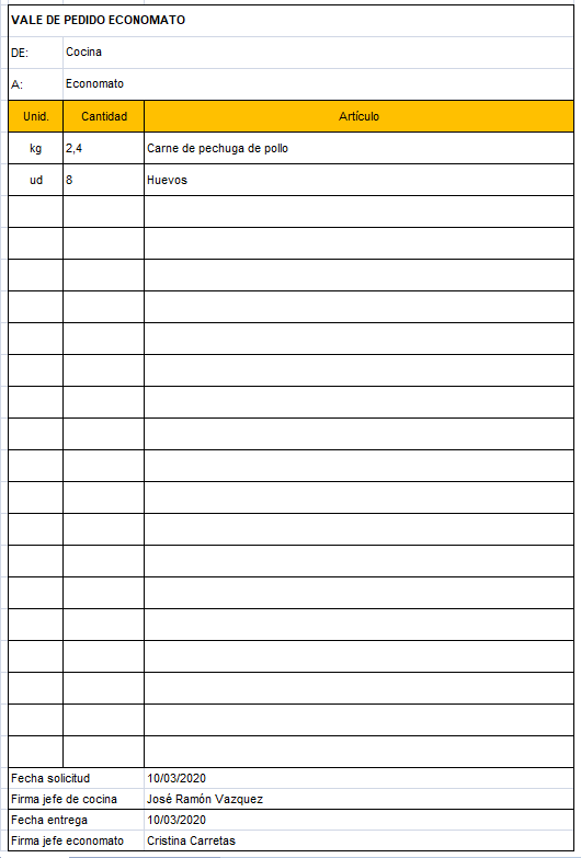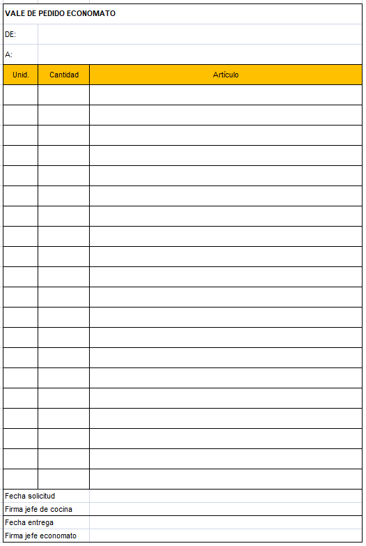 - En base a la ficha técnica y teniendo en cuenta el parte de consumos diarios o relevé, el jefe de cocina hace el pedido correspondiente al economato usando el vale de pedido.