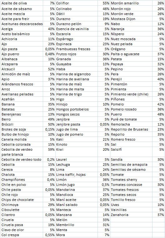A continuación se especifican las mermas de los cereales, frutas, hortalizas y especias más importantes.