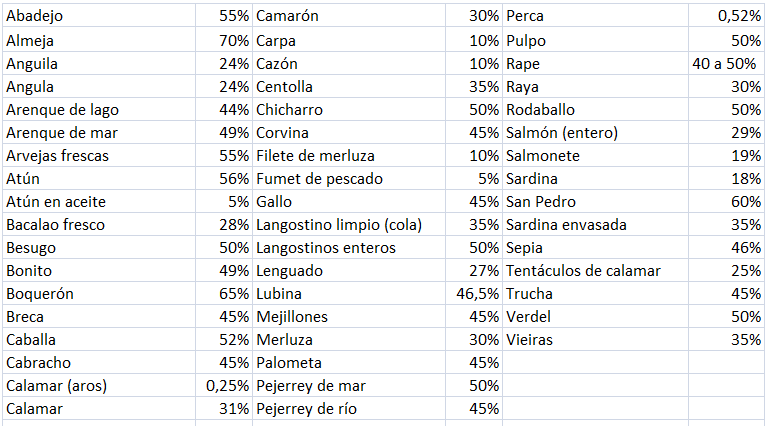 A continuación se especifican las mermas de los pescados y mariscos más importantes.