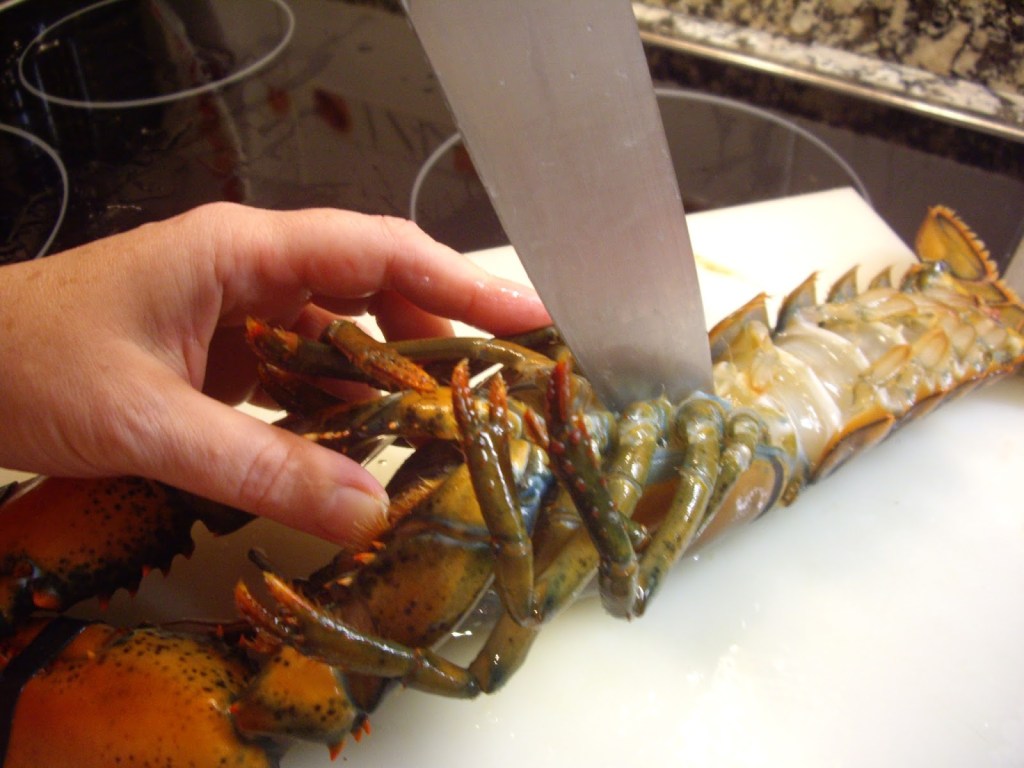 - Cortado a la mitad: se coloca en una tabla con la cabeza hacia nosotros, se introduce el cuchillo en la parte superior del cefalotórax y se corta a lo largo de la cabeza. Después girar y realizar lo mismo con la cola, obteniendo dos mitades. Este proceso se realiza estando vivo el animal.