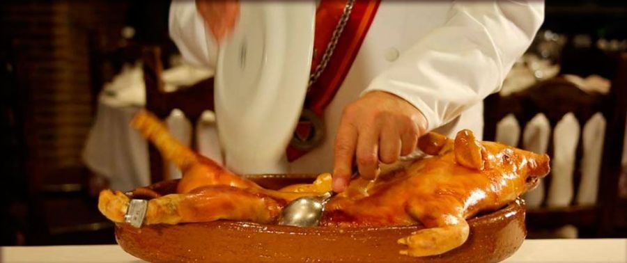 Trinchado del cochinillo de forma tradicional con un plato (se hace así para demostrar que la pieza está tierna, una vez cortado el cochinillo se tira el plato y se rompe) Se procede igual que el ovino o el porcino con la diferencia de que son carnes más tiernas y más pequeñas, son menos jugosas …